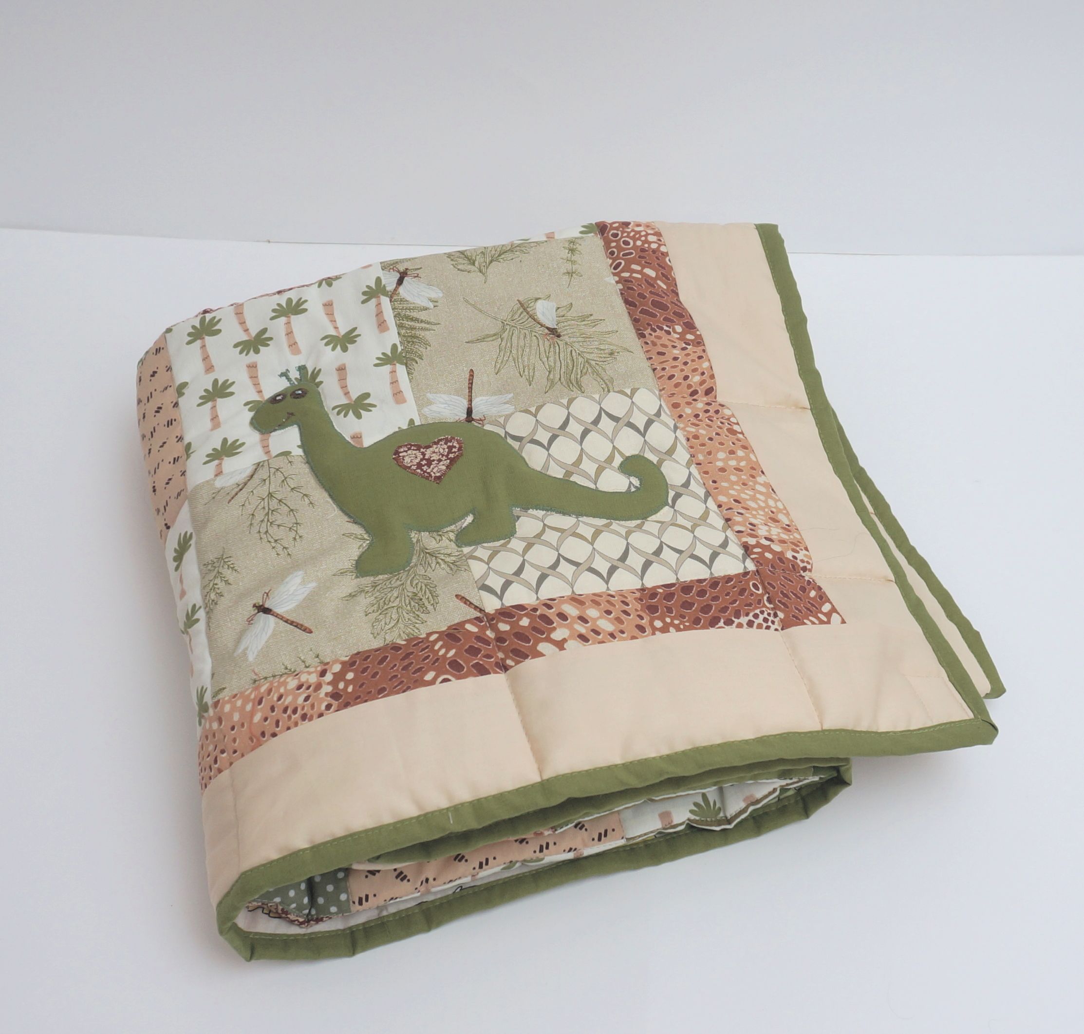 Kodu otsib imearmas pruunikates ja rohekates toonides dinosaurusega lapitekk .