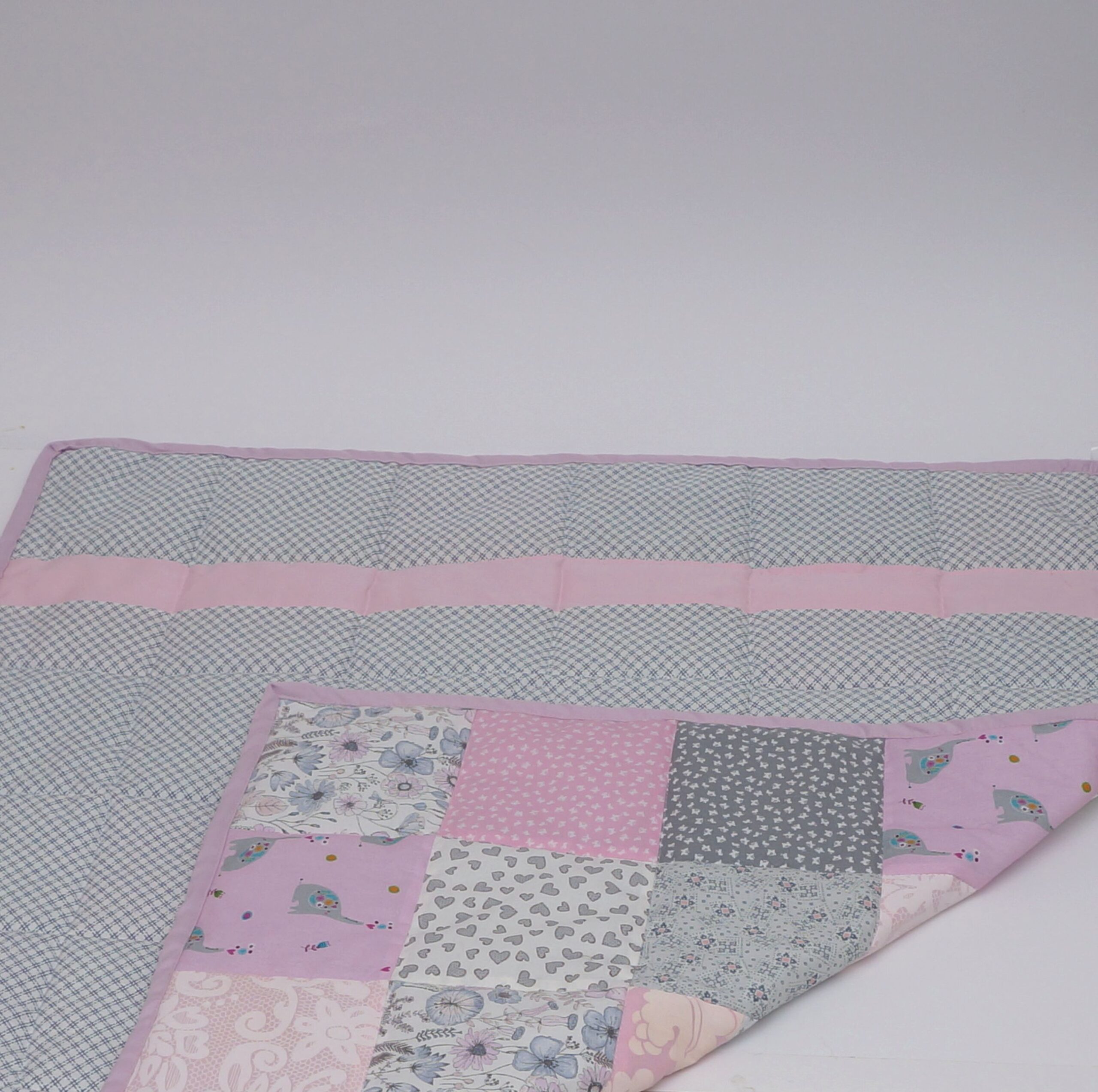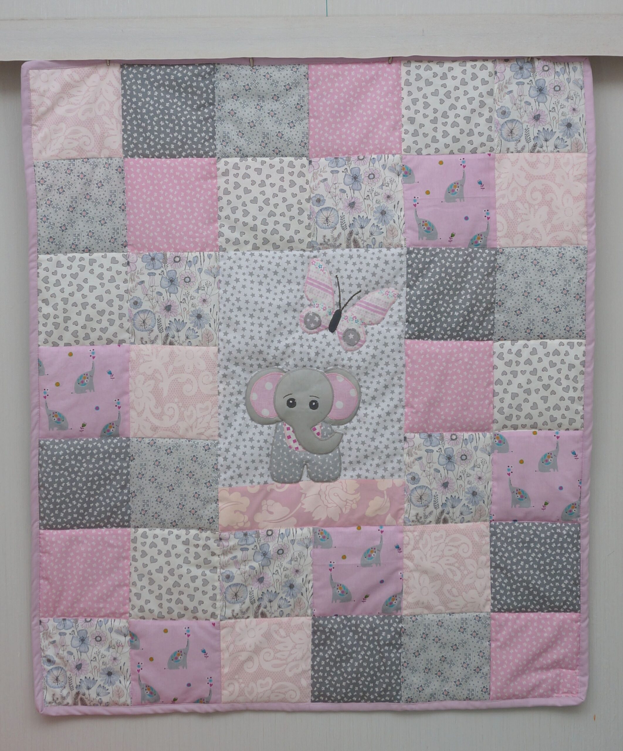 Kodu otsib romantiliselt halli-roosakirju beebitekike. Elevanti peetakse õnne ja jõukuse sümboliks ja kes seda oma beebile ei sooviks… Lapitekk on õmmeldud puuvillastest kangastest, sees mahuline vatiin. Mõõdud 95 x 80 cm.