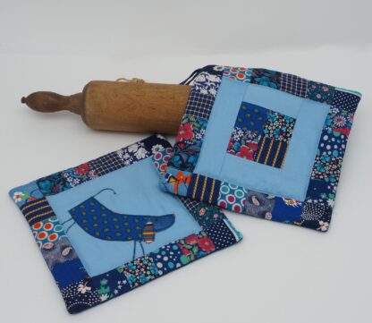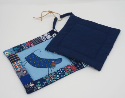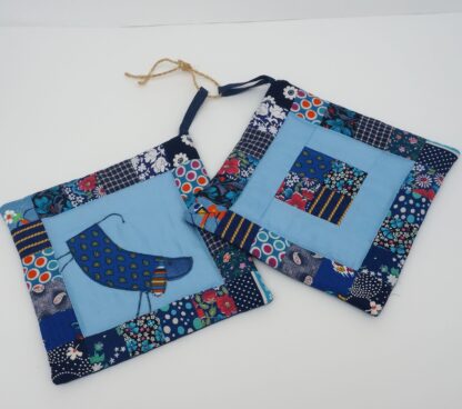 Lapitehnikas pajalapid on õmmeldud puuvillasest kangast, sees paks puuvillane vatiin. Üks pajalapp on lapitehnikas sinisekirju ja teisel aplikatsioonina lustakas sinine koer.