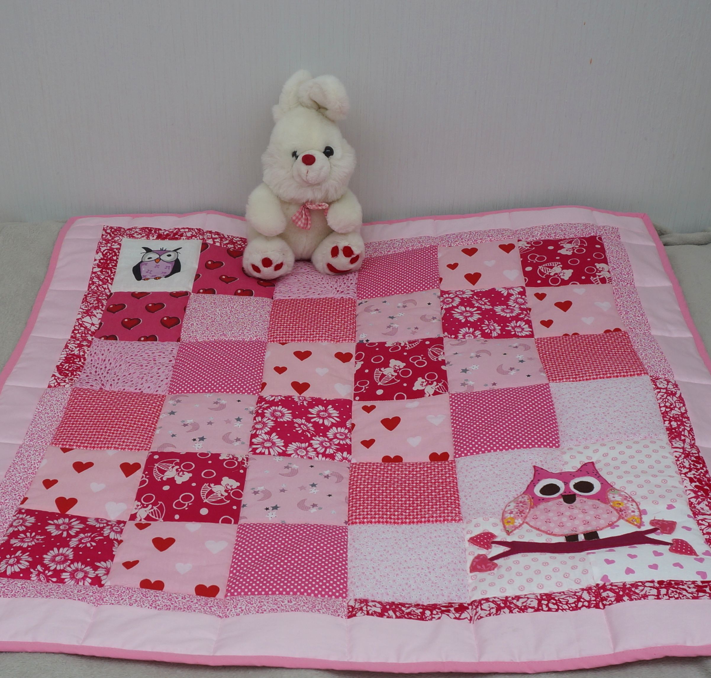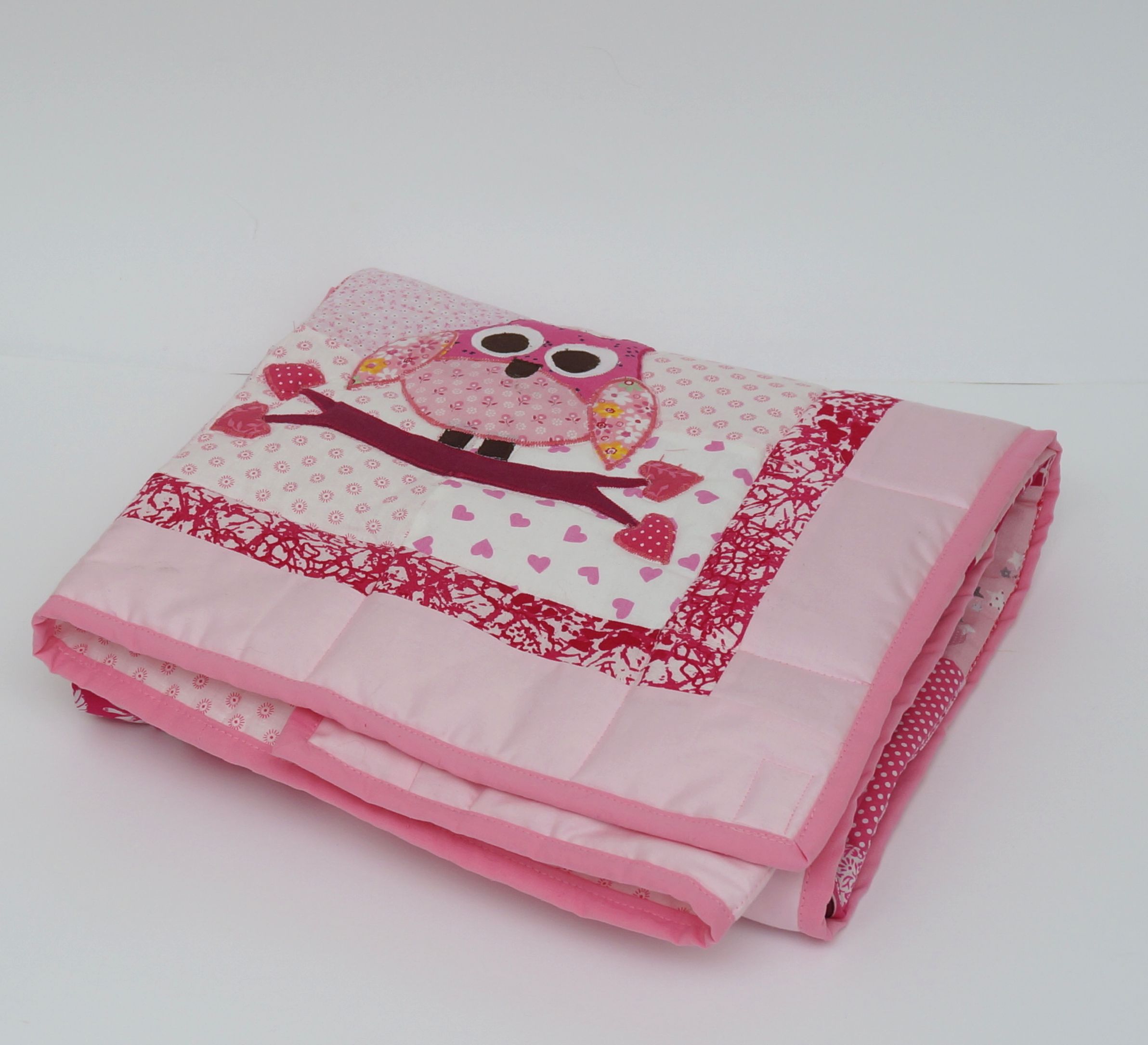 Beebitekk on õmmeldud puuvillastest roosatoonilistest kangastest, sees mahuline polüestervatiin. Teki taga toonilt sobiv puuvillane kangas. Öökull aplikatsiooni tehnikas.